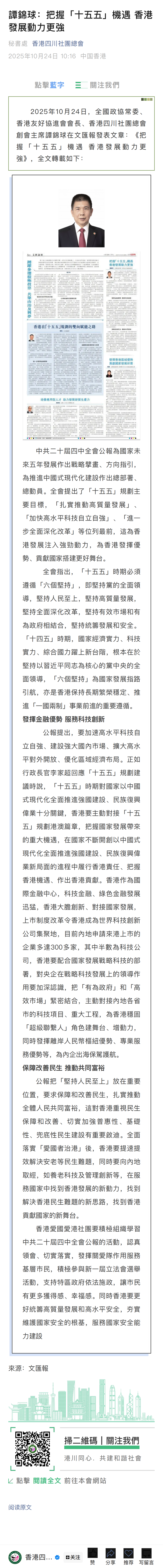 譚錦球:把握「十五五」機遇 香港發展動力更強