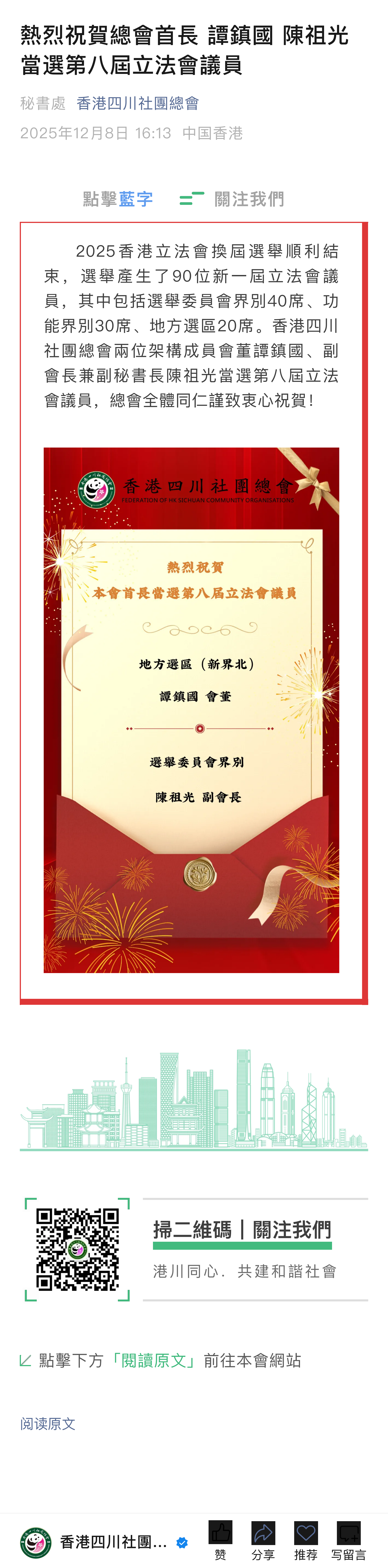 熱烈祝賀總會首長 譚鎮國 陳祖光 當選第八屆立法會議員