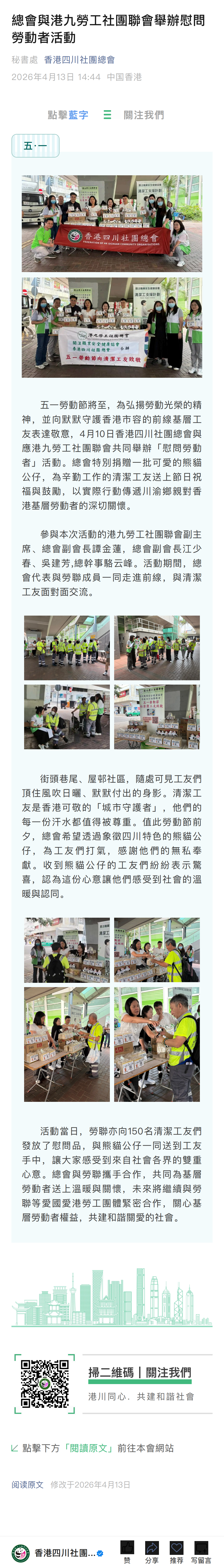 總會與港九勞工社團聯會舉辦慰問勞動者活動