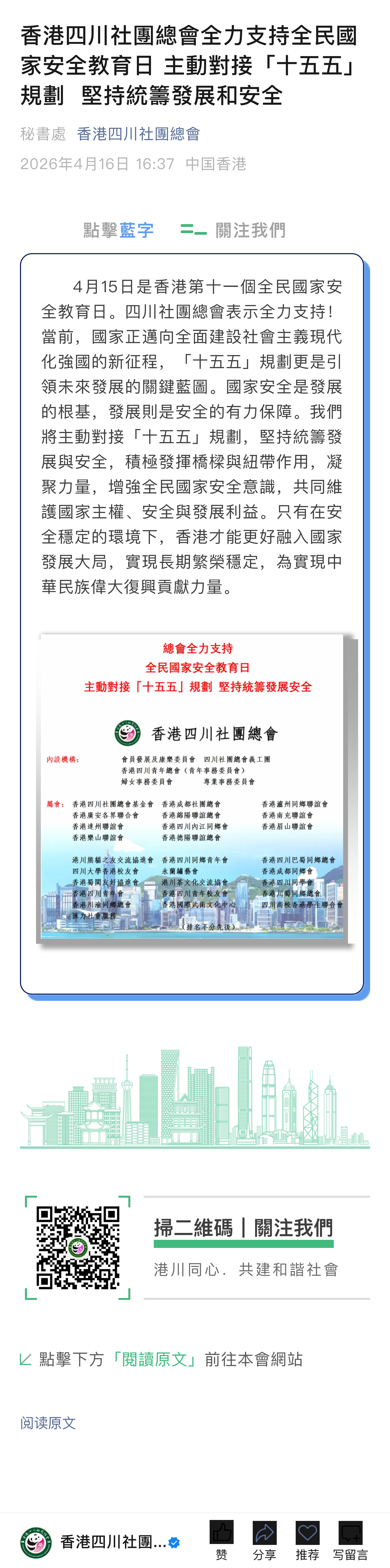 香港四川社團總會全力支持全民國家安全教育日 主動對接「十五五」規劃 堅持統籌發展和安全