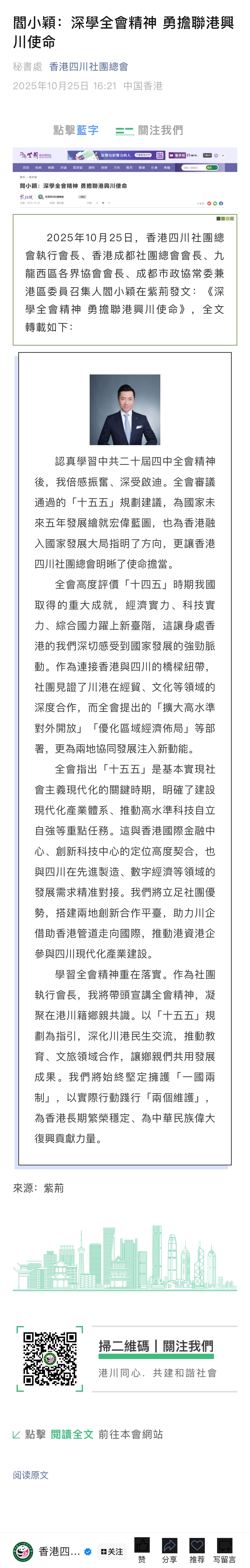 閻小穎:深學全會精神 勇擔聯港興川使命